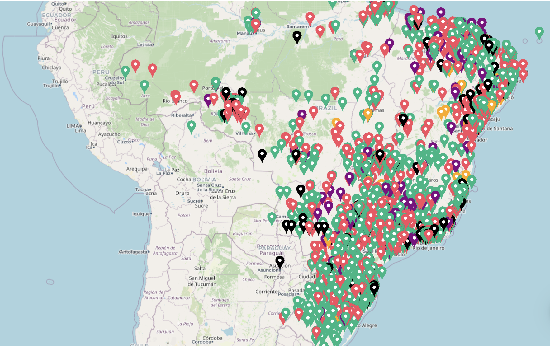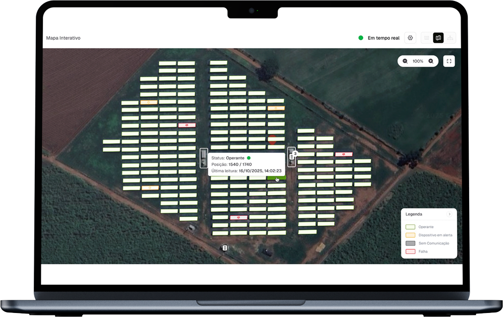 O mapa interativo representa a planta em sua configuração geográfica real, com trackers individualizados e status visual por ativo.