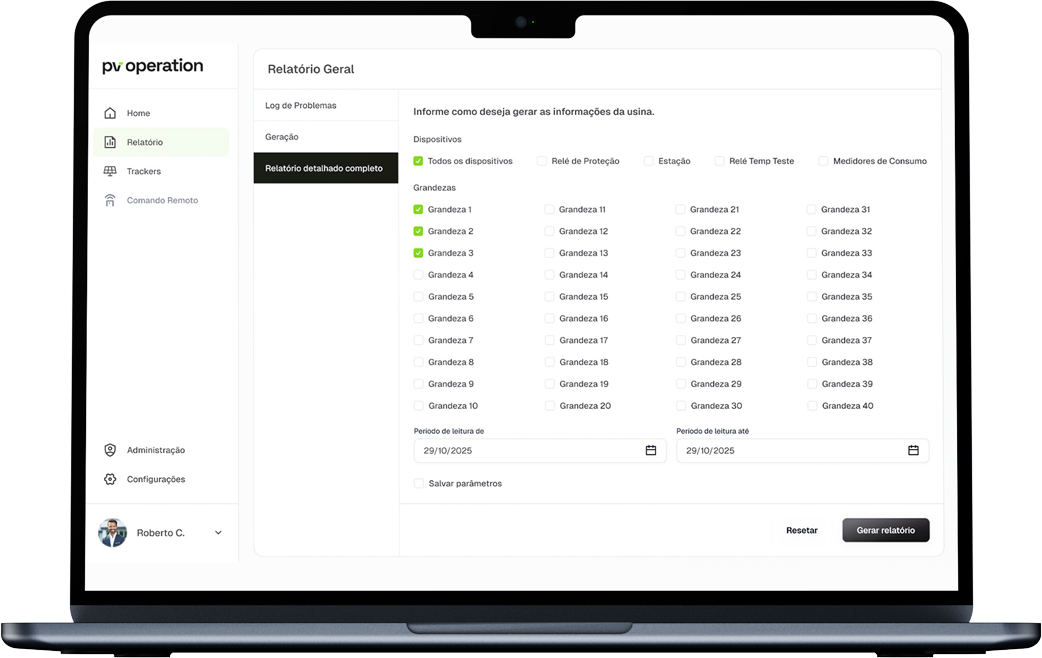 A geração de relatórios permite seleção por dispositivo, grandeza e período customizado, oferecendo base técnica consistente para engenharia, O&M e auditorias.